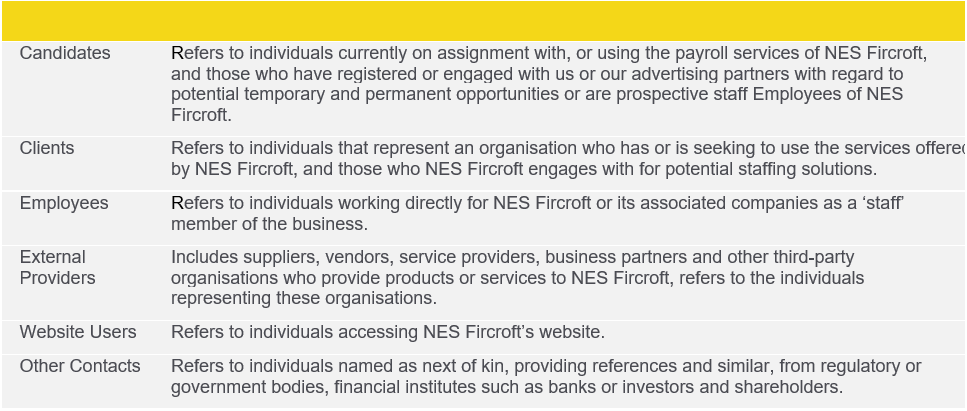 The Personal Data collected by NES Fircroft concerns the following categories of data subjects in relation to our core services and assignment support services: